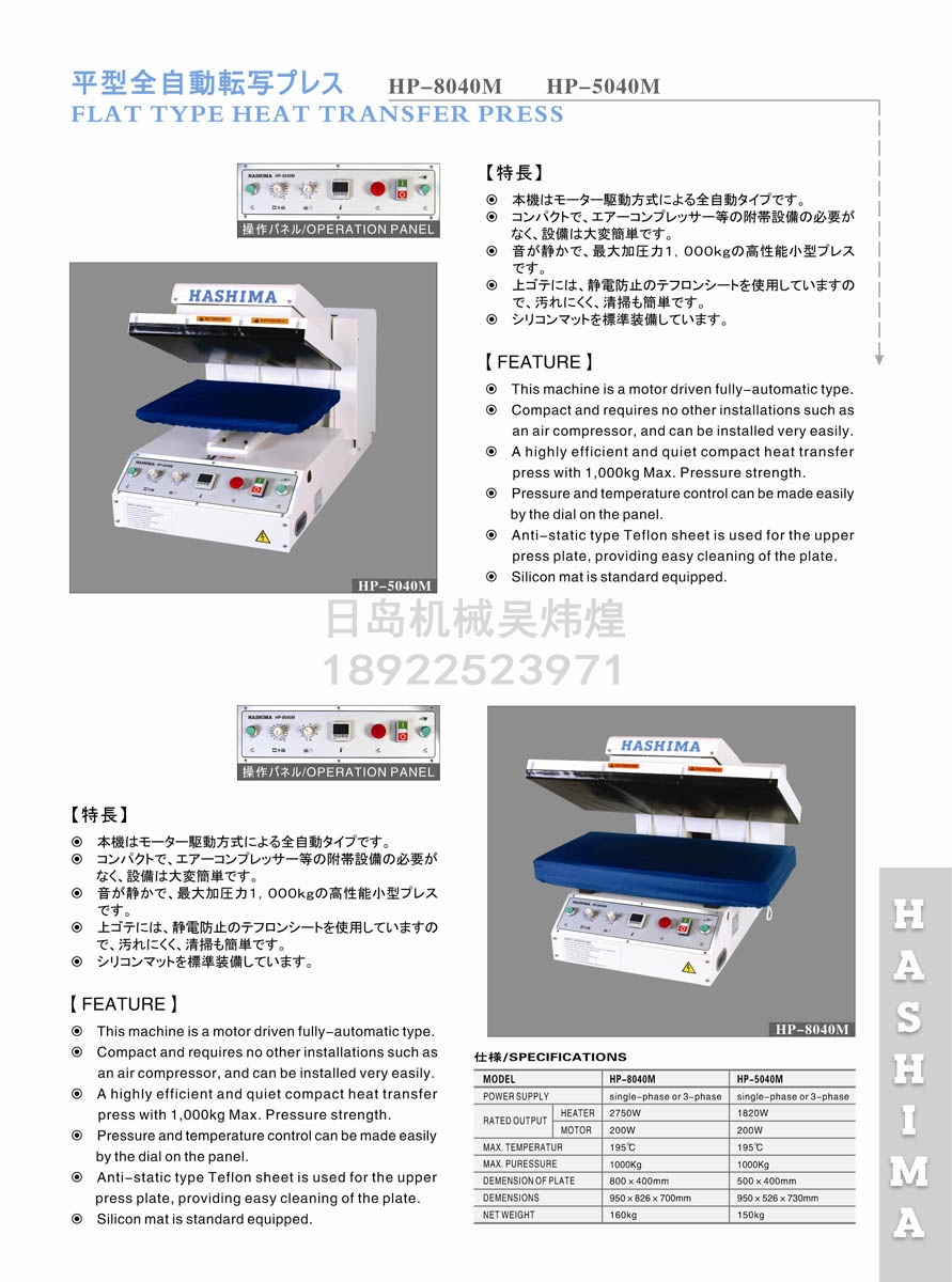 • 羽島HASHIMA HP-5040M/HP-8040M平型自動(dòng)印花機